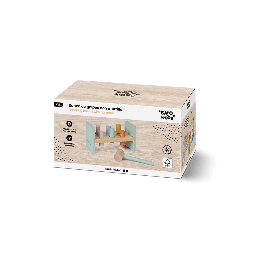 Bum! Bam! Diese lustige Bank wird zum Lieblingsspielzeug Deines Kindes. Sechs bunte Zylinder warten nur darauf, mit einem Holzhammer geschlagen zu werden. Das ist eine perfekte Übung, um die Hand-Augen-Koordination und die motorischen Fähigkeiten zu trainieren. Und wenn sie fertig sind? Einfach die Bank umdrehen und von vorne beginnen.